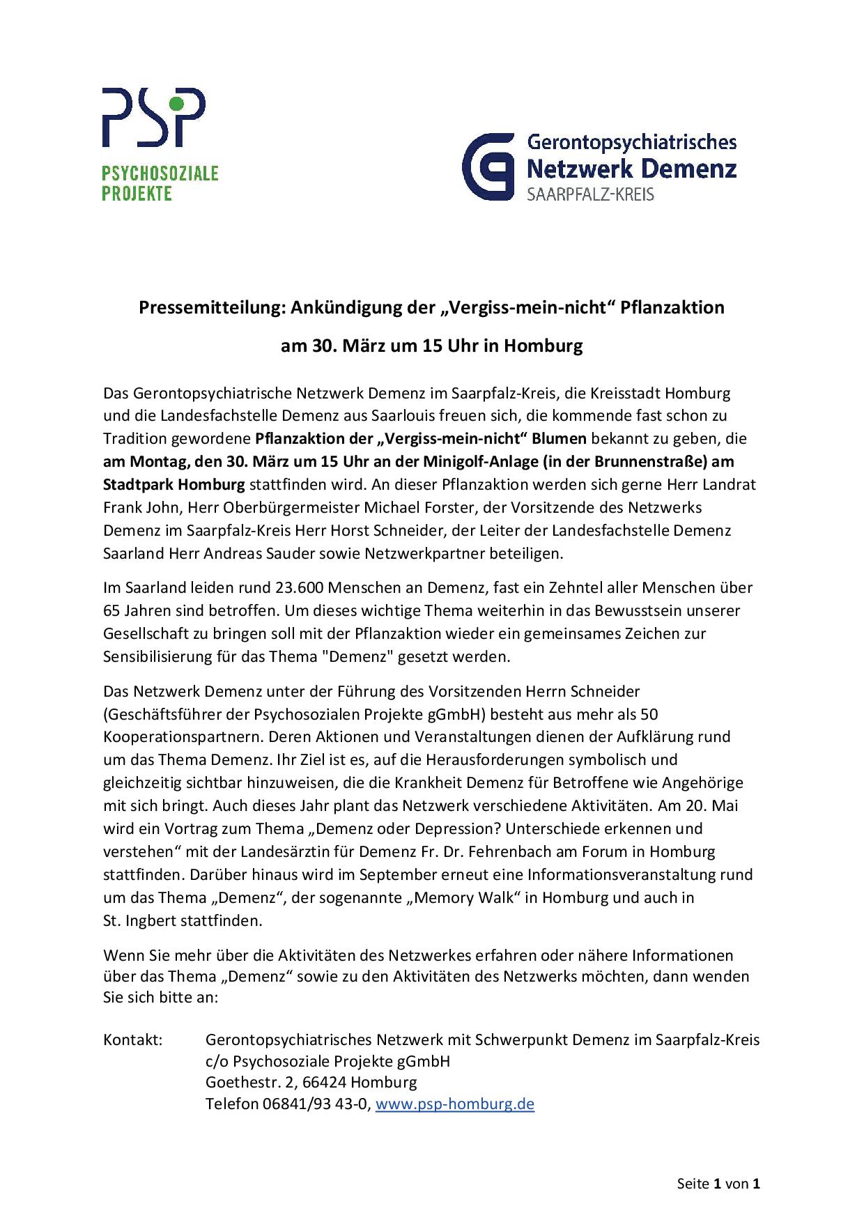 Veranstaltungshinweis – „Vergiss‐Mein‐Nicht“ Pflanzaktion am 30.03.2026