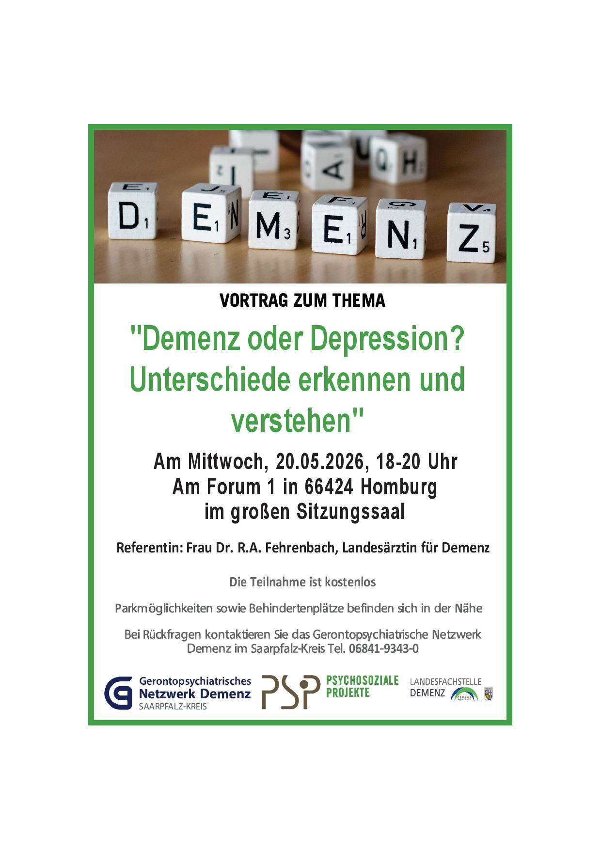 « Alle Veranstaltungen Veranstaltungshinweis – Vortrag Frau Dr. R. A. Fehrenbach „Demenz oder Depression“ am 20.05.2026 Mai 20 @ 18:00 - 20:00 Details Datum: Mai 20 Zeit: 18:00 - 20:00 Veranstalter Gerontopsychiatrisches Netzwerk Demenz Telefon 06841-934322 E-Mail gpnd@psp-homburg.de Veranstalter-Website anzeigen Veranstaltungsort Am Forum 1, 66424 Homburg Zum Kalender hinzufügen Google Kalender iCalendar Outlook 365 Outlook Live Details Datum: Mai 20 Zeit: 18:00 - 20:00 Veranstalter Gerontopsychiatrisches Netzwerk Demenz Telefon 06841-934322 E-Mail gpnd@psp-homburg.de Veranstalter-Website anzeigen Veranstaltungsort Am Forum 1, 66424 Homburg